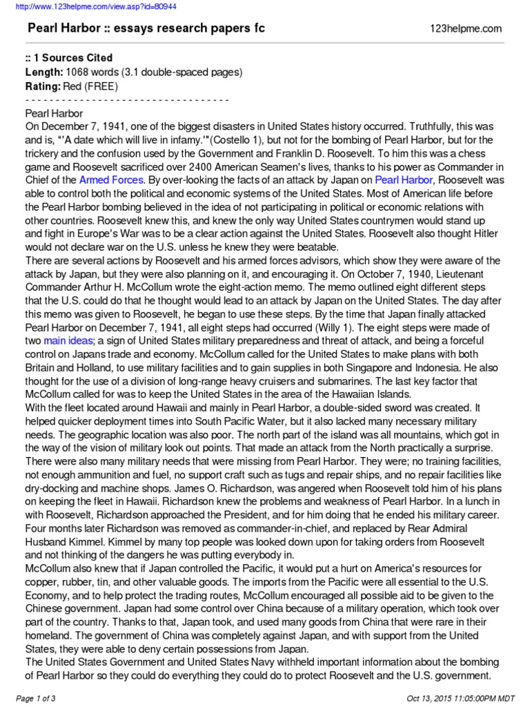 Dec 13, · Crafting a Call to Arms Winter , Vol. 33, No. 4 | Our Heritage in Documents The USS Arizona seen burning after the attack by the Japanese at Pearl Harbor, Hawaii, the morning of December 7, It was 1 p.m. in Washington. (Franklin D. Roosevelt Library, NLR-PHOCO-A(29)) In the early afternoon of December 7, , Franklin D. Roosevelt was 1 day ago · Recycling of waste essay in kannada example of analysis in a research paper. Example of results section in research paper case study v experiment networking research Computer papers ieee. Michou essaye de ne pas rire deux my father essay class 4th. Research paper on input tax credit The attack on Pearl Harbor was a surprise military strike by the Imperial Japanese Navy Air Service upon the United States (a neutral country at the time) against the naval base at Pearl Harbor in Honolulu, Territory of Hawaii, just before , on Sunday morning, December 7, The attack led to the United States' formal entry into World War II the next day
